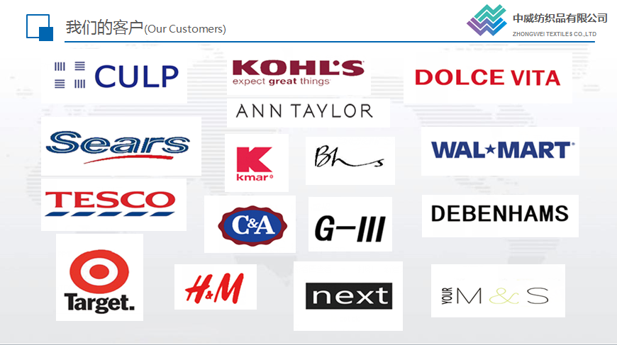 中威紡織主要經(jīng)營麂皮類家紡及各類服裝面里料,并可根據(jù)客戶要求研發(fā)、生產(chǎn)及深加工各類面料。公司產(chǎn)品遠(yuǎn)銷美國、墨西哥、南美、歐洲等世界各地。公司自成立以來,憑著優(yōu)良的品質(zhì)、合理的價格以及完善的服務(wù),贏得了國內(nèi)外客戶的信賴。目前公司已與世界眾多大品牌建立了良好的業(yè)務(wù)往來。